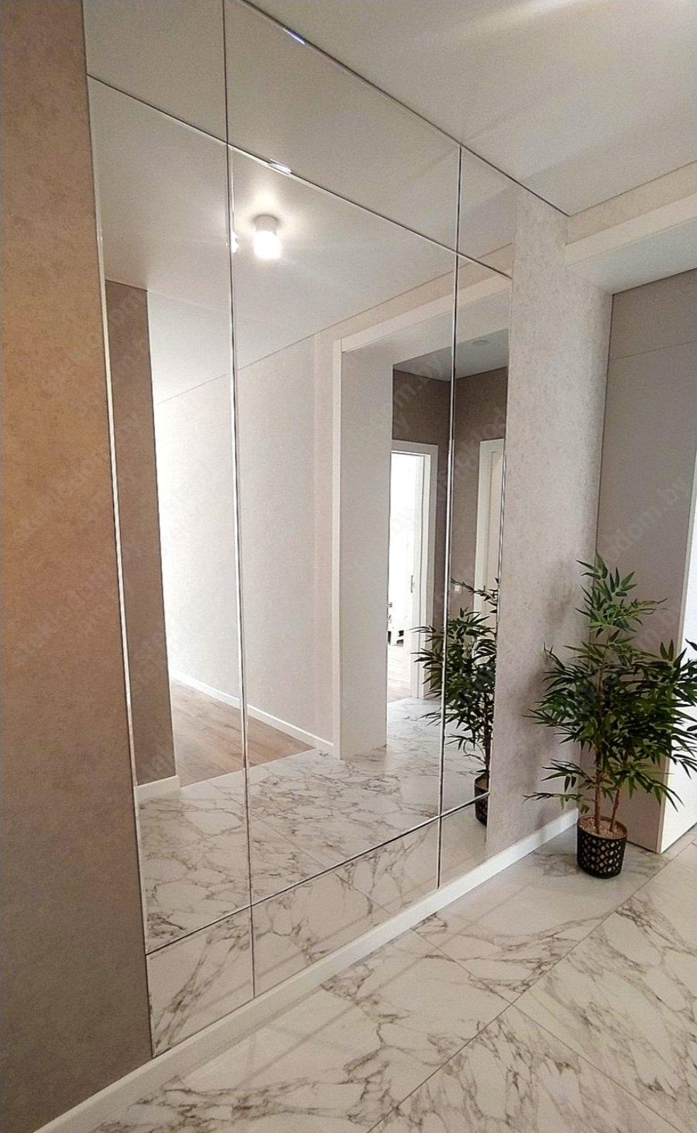 Зеркало несъёмное, наклеено на стену. Зеркало в виде квадратов по углам панно, по бокам прямоугольные полосы и в центре основное большое зеркало, в которое можно увидеть себя в полный рост. Каждая деталь с фацетом. Размеры зеркала разные, рассчитываются исходя из габаритов стены, которую нужно закрыть зеркалом. Выклеиваются друг к другу как панно. Гарантия на амальгаму зеркала 1 год.
